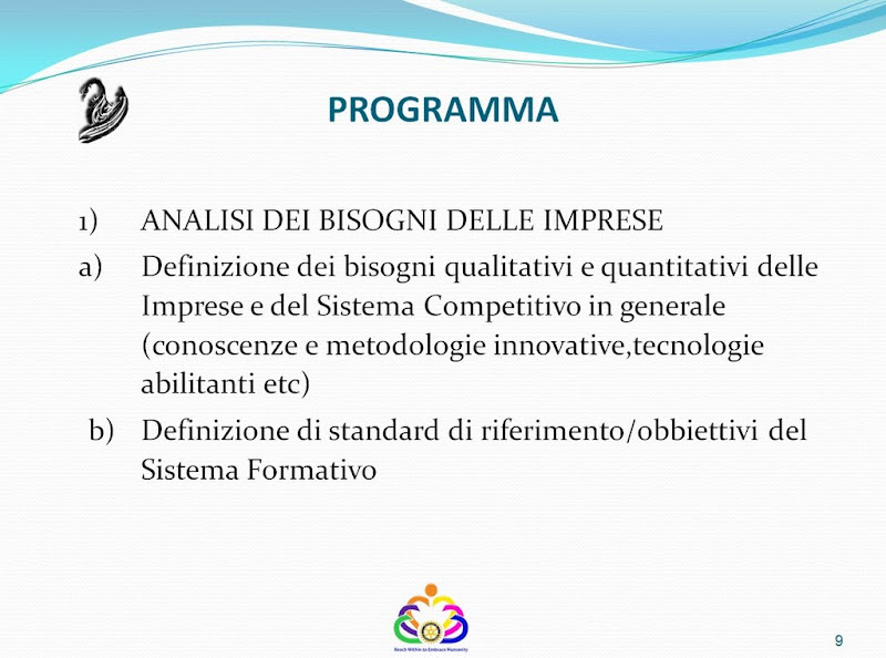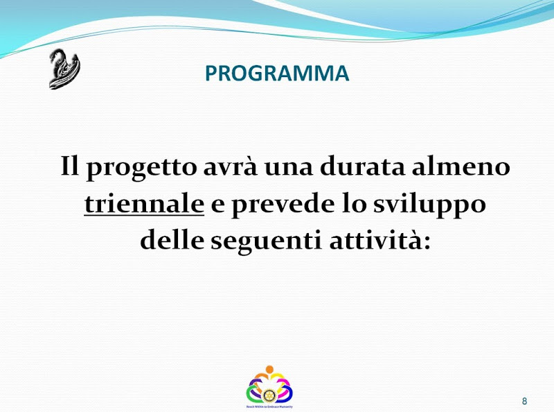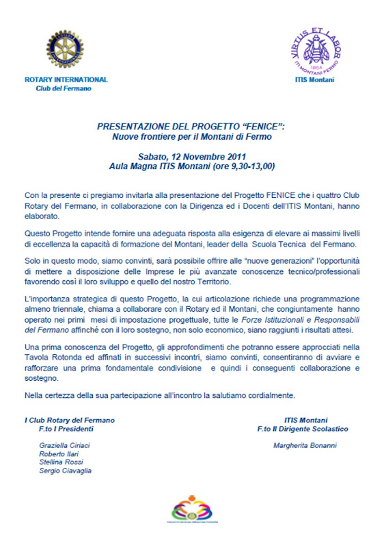 Carissimi, in collegamento con Margherita è stato definito il programma dell'incontro di sabato 12 novembre al Montani per la presentazione del progetto FENICE che trovate in allegato. I Responsabili Istituzionali sono stati tutti avvertiti e prenotati. Si tratta certamente di un incontro impegnativo in cui noi rotariani, presentandoci uniti alle componenti del Montani: Dirigenza, Docenti ed in qualche modo Studenti, andremo a chiedere alle Istituzioni e soprattutto ai Responsabili di condividere con noi il percorso progettuale elaborato in questi primi 8 mesi di attività e darci fiducia fornendo progressivamente le risorse economiche per realizzare i vari sottoprogetti che verranno proposti. Credo sia fondamentale avere al nostro fianco il Distretto 2090 con i Governatori : Francesco Ottaviano (2011-12) e Mauro Bignami (2012-13) ma anche i nostri Club con i Presidenti Incoming in testa. Sarà inoltre importante che ci si attivi tutti perchè siano presenti all'incontro anche Titolari di Azienda nostri amici che possano essere meglio convinti a dare il loro contributo alla realizzazione del Progetto.A questo scopo ritengo sia anche dimostrativo del nostro impegno rotariano ufficializzare che i Club del Fermano, oltre all'impegno di tempo e professionalità di chi sarà più coinvolto nelle attività di progetto, metterà a disposizione risorse economiche nelle tre annate per accelerare l'avvio e la realizzazione del Progetto.Questo ritengo sia essenziale per dare, proprio il 12 novembre, una scossa al sistema Istituzionale ed una iniezione di fiducia ai Docenti e a tutto l'Istituto: per quanto mi riguarda , ritengo io debba personalmente procedere in tal senso.Un caro abbraccio a tutti Paolo Appoggetti