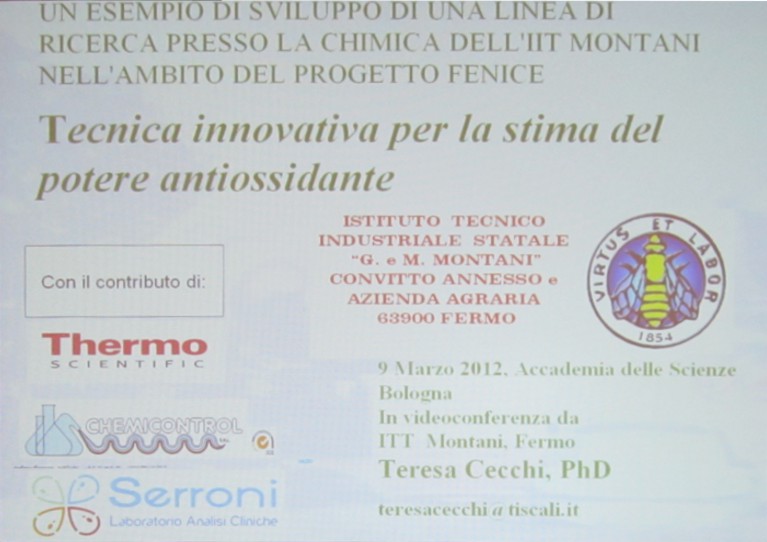 Oggi, 9 marzo alle ore 10, in videoconferenza presso l'aula Magna dell'ITI di Fermo si è tenuto il Seminario organizzato dall'Accademia delle scienze dell'istituto di Bologna (vedi depliant allegato). Il programma (vedi > allegato) ha previsto l'intervento della nostra prof. Teresa Cecchi che ha parlato di "Un esempio di sviluppo di una linea di ricerca presso i Corsi di Chimica dell'Istituto Tecnico Industriale Montani di Fermo nell'ambito del Progetto Fenice, "Tecnica innovativa per la stima del potere antiossidante". Sponsor per il Montani la Termo Scientific, il Laboratorio di analisi chimiche Serroni la Chemicontrol. Il seminario che come si vede dai relatori è stato di elevatissimo livello a affrontato nel pomeriggio temi fondamentali come i principi etici dell Scienze nell'eliminazione dell Armi di distruzione di massa, la convenzione sul disarmo chimico come espressione dei Principi Etici della scienza e la pandemia da armi biologiche e bioterrorismo come distruttori di pace. Siamo molto orgogliosi che la nostra docente sia stata invitata come relatrice ad un convegno di elevatissio livello culturale e dedicato a chimici di livello nazionale ed internazionale. Margherita Bonanni Preside ITIS di Fermo